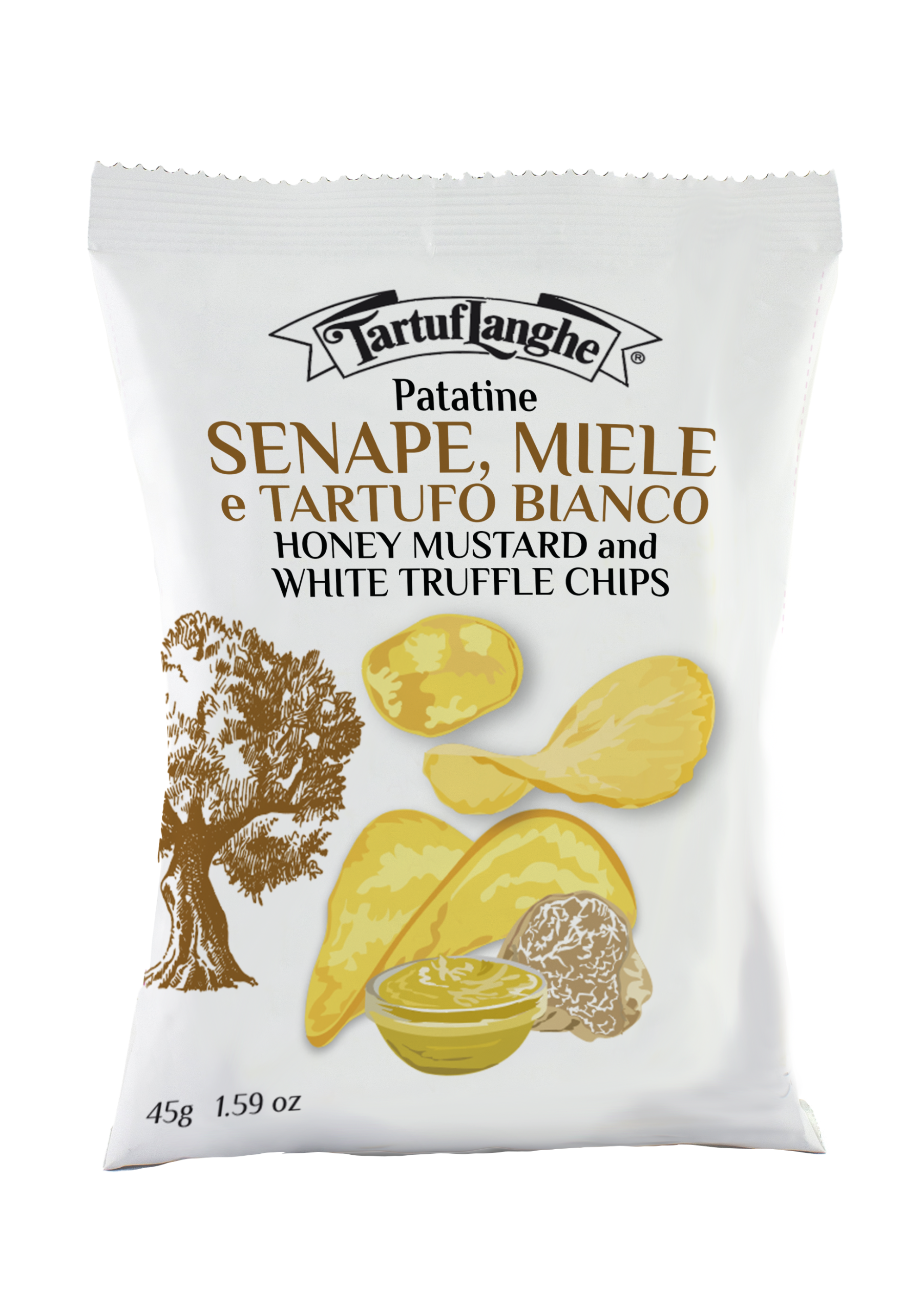 Zutaten: Kartoffeln, Sonnenblumenöl, Gewürzpulver 6% [Kartoffelmaltodextrin, Maismaltodextrin, Zucker, modifizierte Stärke, davon Senfkörner 5%, karamellisierter Zucker, Aromen, davon Honig 3%, Alkoholessig, Weinessig, Salz, davon gefriergetrocknete weiße Trüffel (Tuber magnatum Pico) 0,5% (entspricht 2,5% frischer Trüffel), Gewürze], Olivenöl, Salz.